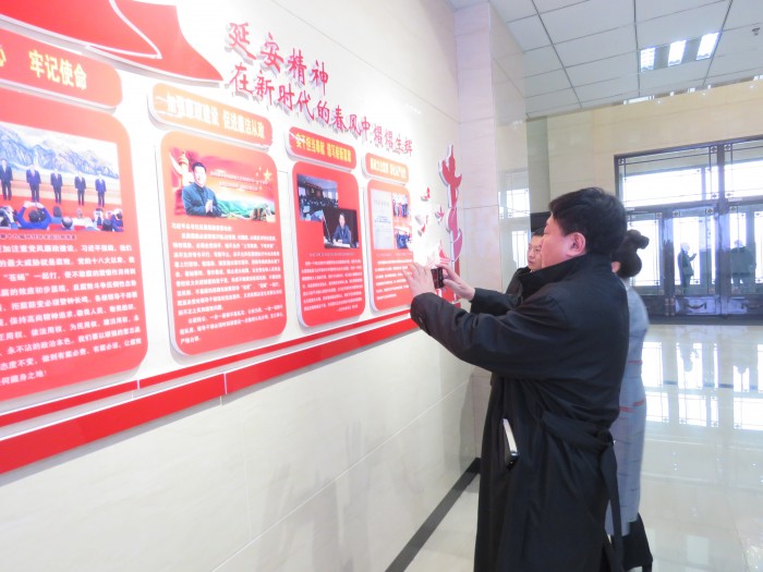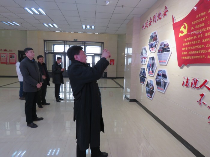 在北安市人民法院“从延安到北安”红色文化教育长廊,《党的生活》杂志社社长、主编李小平一行在讲解员的带领下,参观了长廊的四个区块:延安精神、红色基因的传承、在时代的春风里熠熠生辉、法院人不忘初心牢记使命。《党的生活》杂志社社长、主编李小平对北安法院能够紧紧围绕打造“塞北延安”红色文化名城战略、将延安精神与北安精神充分融合,并通过开展独具特色、形式多样、载体新颖、内容丰富的红色文化主题教育长廊给予高度评价,对北安法院干警能够传承和发扬红色革命传统,弘扬红色文化,引导法院人“不忘初心、牢记使命”的坚定理想信念给予高度赞赏和充分肯定,不时地拿出手机拍照留念。