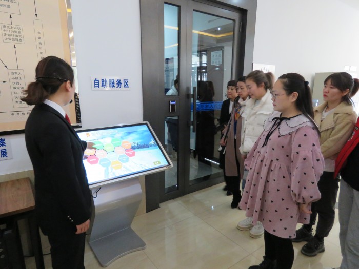 在诉讼服务中心,讲解员为大家介绍了北安法院各项科技应用,依托诉讼服务中心、网上立案平台、和12368诉讼服务热线,不断拓展服务当事人和社会公众的渠道和内容,积极提供网上立案、电子送达、文书查询、智能云柜等交互式、全方位、立体诉讼服务,实现重要信息主动告知、即时查询和有问必答,已经初步形成了线上线下、庭里庭外多样化的司法服务,让群众少跑路,使司法更贴近群众。