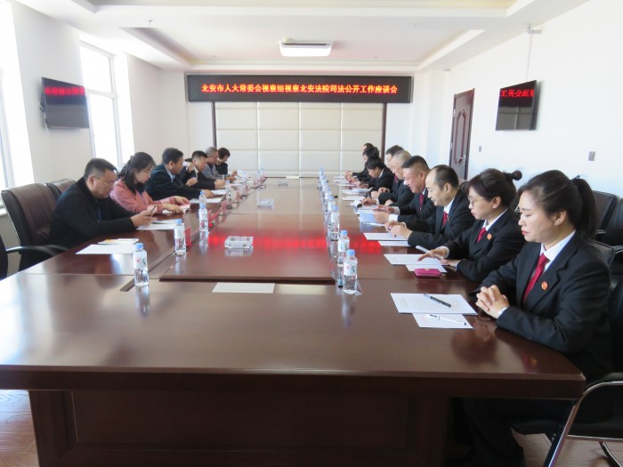 在座谈会上,北安法院党组书记、院长于树军向北安市人大常委会视察组汇报了2017年以来北安法院司法公开工作开展情况,并对存在的问题进行梳理,提出有针对性地下步工作打算。北安市人大常委会副主任王春清表示,视察北安法院司法公开工作是2019年北安市人大常委会确定的重点工作之一,来到北安法院体会到了耳目一新的感受,对北安法院的司法公开工作给予了充分的肯定,认为北安法院的司法公开工作起步比较早,行动比较快,在推进司法公开方面方法多、有创新,公开的信息量大覆盖面广,公众参与和知晓率高,取得较好的社会效果。王春清副主任也提出,北安法院在今后开展司法公开工作中要始终坚持“主动、依法、及时、全面”的公开原则,要不断加强自身学习提高素质,不断完善软件建设,加强对外宣传工作,积极探索,勇做司法公开工作先锋者。代表们也纷纷表示通过参观北安法院、观看宣传片感觉很震憾,感受了科技化的基础设施建设、规范化和常态化的管理、队伍振奋的精神状态、良好的工作作风和改革创新的工作精神。