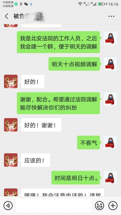 2月21日,北安法院双青法庭庭长张佳学通过微信在线调解的方式成功调解了一起民间借贷纠纷案件,疫情期间既保障的当事人的人身安全,又维护了当事人的合法权益。