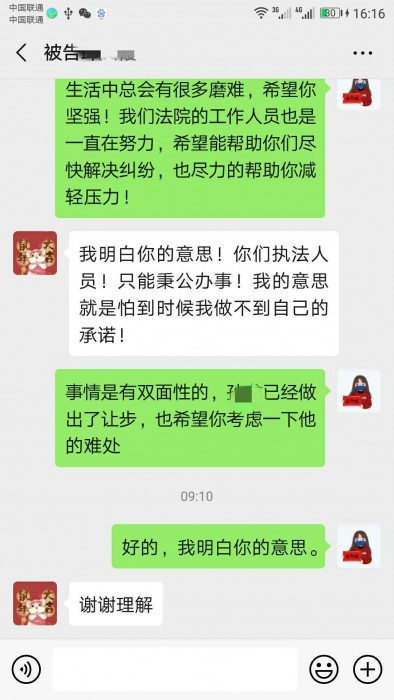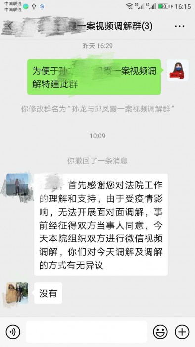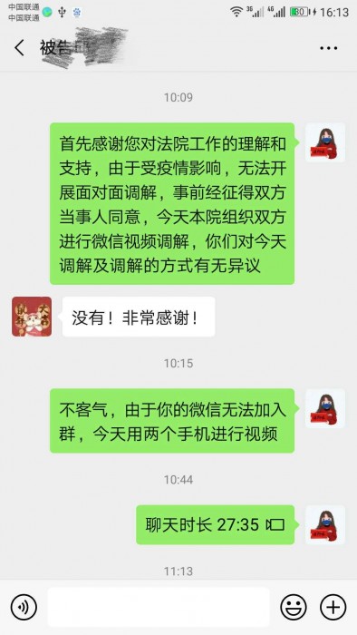 “新冠肺炎”疫情爆发后,为保障双方当事人安全,无法促成双方当事人进行“面对面”的调解。“疫情防控不放松,诉讼服务不打烊!”张佳学法官在防疫一线工作的间歇指导法官助理栾桂平与当事人进行沟通,在通过电话、微信等方式征得当事人同意后,终于通过微信视频的方式促成了孙某与邱某霞达成调解协议。