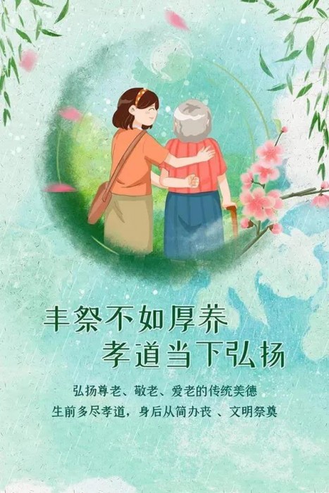 四、节俭祭祀。遵守社会公德,崇尚孝老、尊老、敬老传统美德,树立厚养薄葬新观念。提倡对在世老人尽孝心,多关心孝敬老人,使他们老有所养、老有所乐;老人逝去时,不大操大办、铺张浪费、相互攀比,以节俭方式寄托哀思。