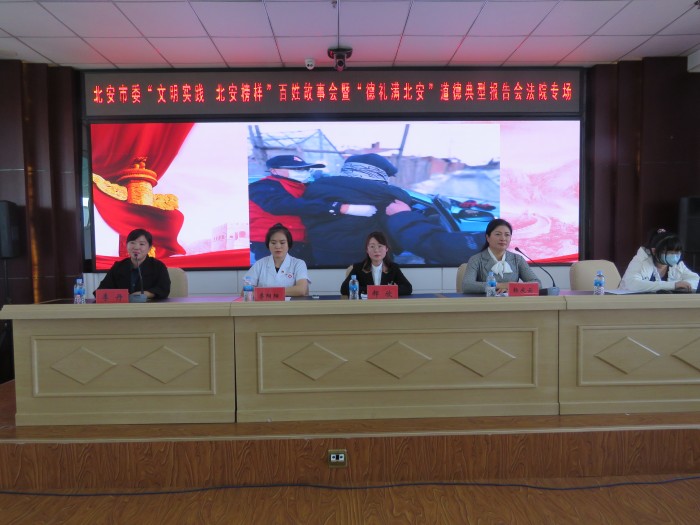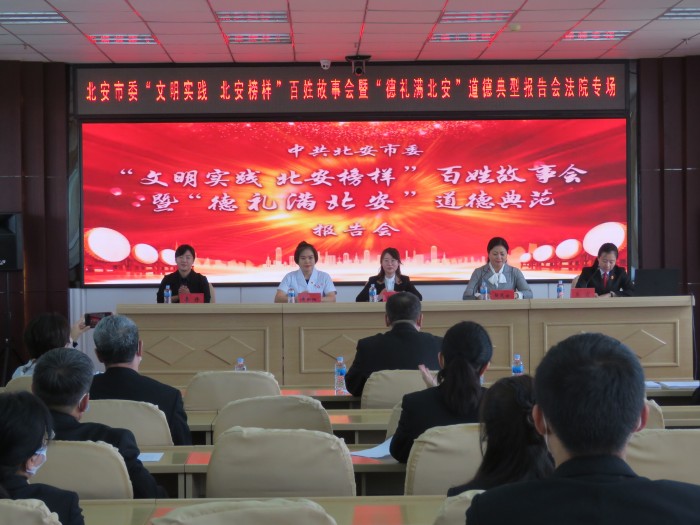 为充分发挥榜样楷模的示范引领作用,推进文明城市创建工作深入开展,引导全院干警形成崇尚道德榜样、学习道德榜样、争当道德榜样的浓厚氛围,9月21日上午,“北安市委“文明实践 北安榜样”百姓故事会暨“德礼满北安”道德典型报告会”走进北安法院,通过身边的道德榜样和感人故事,宣扬敬业奉献、克己奉公等优秀品质,院党组书记、院长于树军同全院干警一同聆听了报告会。