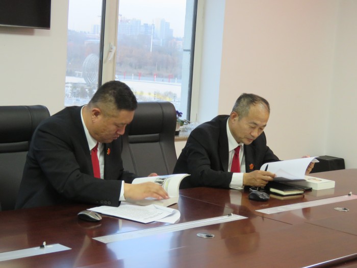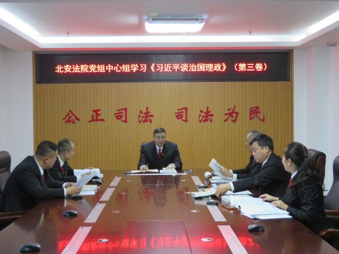 10月26日,北安法院党组书记、院长于树军主持召开党组理论中心组学习会议,研究部署党组理论中心组及全院干警关于《习近平谈治国理政》第三卷学习,并带领班子成员就开篇之作进行集中学习。