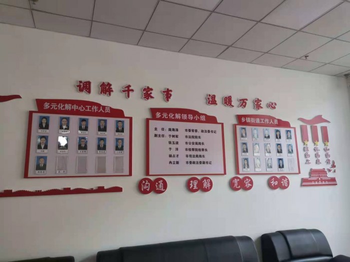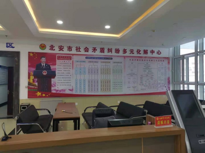 在市委政法委的领导下,将矛盾纠纷多元化解工作纳入全市社会治理工作体系,成立了“北安市矛盾纠纷化解中心”,设立在北安法院诉讼服务中心三楼。成立了以政法委书记为组长,公检法司信访负责人为副组长,行业部门、乡镇街道负责人为成员的领导小组,主要负责全市矛盾纠纷的排查预警、分析研判、调处化解、督办考核等职责,协调指导社会各方资源,共同参与矛盾纠纷多元化解,形成了“党委领导、政法委牵头、“社会参与、多元并举、法治保障”的工作格局。为了便于开展调解工作,“中心”内设一厅三部八室(其中包含巾帼婚调工作室、仲裁办公室、心灵调解室、视频调解室),协调相关部门,配备专职工作人员7名,专职调解员80名,聘请行业领域专家55名,现已进驻公安、综合执法、住建和市场监督等10个单位。整合了原分布在司法局所辖的人民调解、各行政机关的行政调解以及人民法院的诉前诉中调解等相关职能,形成市级层面具有人民调解、行政调解、司法调解等多元化解机制的“一站式”调解机构,实现了矛盾了实时对接和快速处理。