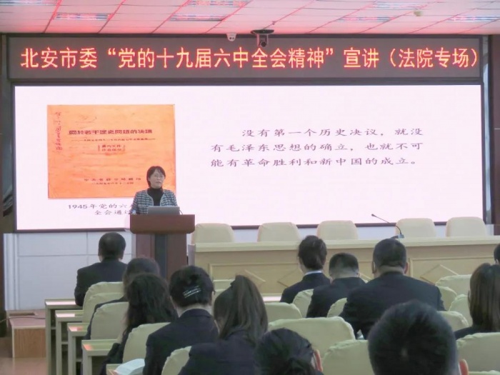 为深入学习宣传贯彻党的十九届六中全会精神,切实把全院干警的思想和行动统一到党的十九届六中全会精神上来,11月23日下午,“党的十九届六中全会精神”北安市委宣讲团副团长、市委党校副校长周泓走进北安法院,为法院干警解读党的十九届六中全会精神,院党组成员、副院长崔巍主持会议,院班子成员、法院部分干警参加会议。