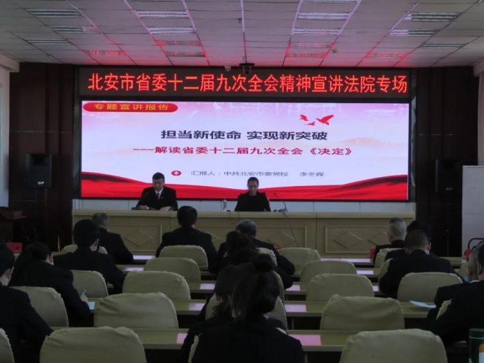 为了深入学习贯彻省委十二届九次全会精神,引导全院干警以建党100周年为新起点,不忘初心,牢记使命,开拓进取,砥砺前行,10月12日下午,北安市省委十二届九次全会精神宣讲成员,中共北安市委党校高级讲师李冬辉到北安法院宣讲省委十二届九次全会精神,北安法院党组书记、院长于树军主持宣讲会议,院班子成员及全院干警在九楼会议室聆听宣讲。