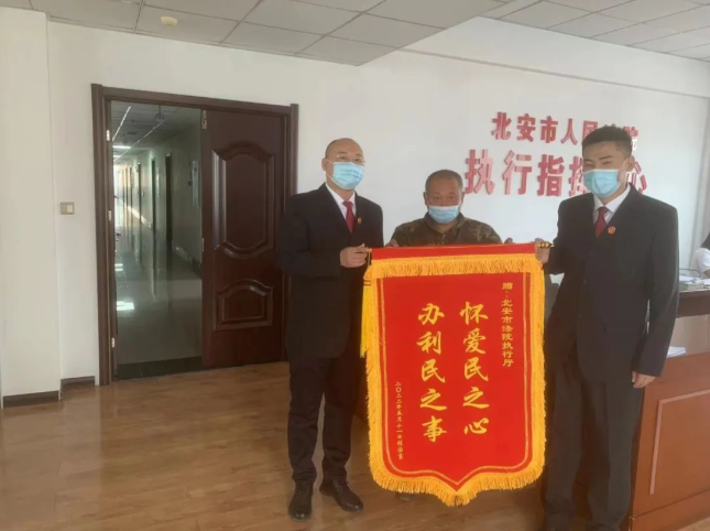 至此,案件执行完毕。申请执行人程某激动的拿着锦旗到执行局说:“感谢法院为我把钱执行回来,现在正是种地时间,急需这笔钱”。