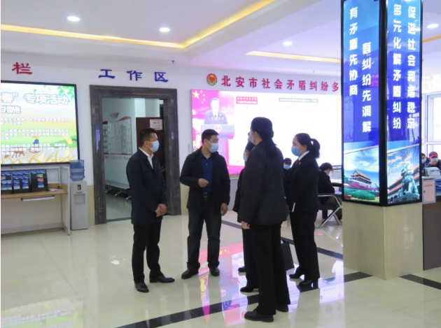 王君一行实地查看了北安法院诉服大厅、矛盾多元化解中心、诉前调解室。在随后的座谈会上,王春胜对北安法院一站式多元解纷机制和诉讼服务中心、立案繁简分流工作、最高法院诉讼服务指导中心信息平台质效评估指标等工作进行了详细汇报。听取汇报后,王君对北安法院“一站式”诉讼服务工作情况给予了充分肯定和高度评价。随后,张立新对北安法院诉讼服务指导平台的得分情况及得分规则进行了详细指导,协助北安法院查找短板弱项,并对存在的问题逐项对标对表,提出建议和整改意见,助推我院此项工作抓实抓细。