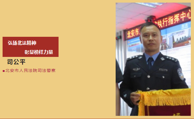司公平,男,2010年考入北安市人民法院工作,现任北安市人民法院司法警察,协助执行局执行工作。十几年如一日,披肝沥胆,备战在执行一线,他秉持公平正义的执法理念、司法为民的服务情怀,以踏实敬业的工作态度,无私奉献的工作精神,用热血与青春诠释着新时代青年司法警察对法院执行事业的执着追求,在平凡的岗位上创造着不平凡的业绩。连续多年被评为北安市人民法院优秀公务员。