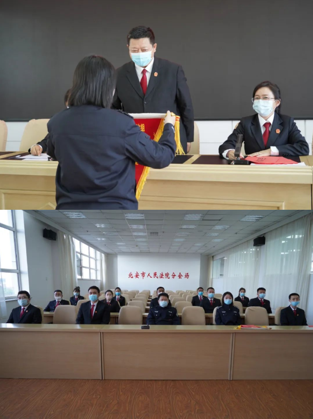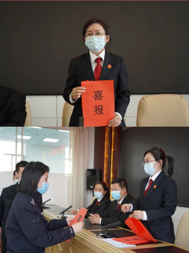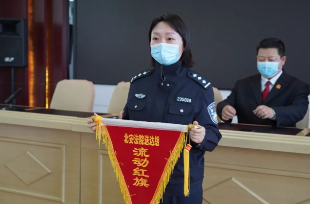 6月8日下午,北安法院副院长王春胜在九楼会议室为荣获首期送达流动红旗的第一送达小组授旗,用以鼓励第一送达小组在送达工作中取得的优异成绩。