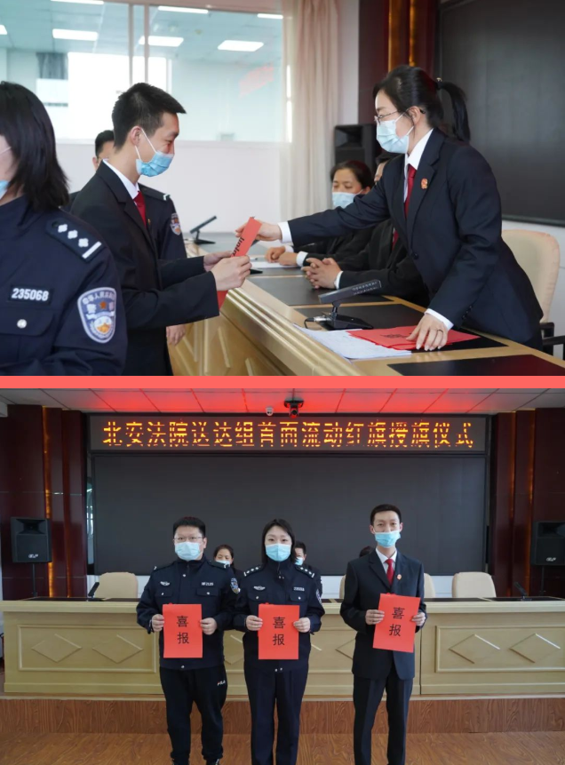 北安法院送达组分为三小组,第一组成员包括李娜、薛萌、祝恺阳、高为、王世亚、王长军;第二组成员为冯浩然、戴天游、赵志辉、栾永强、尚玉胜;第三组成员为周雷、李明航、张磊、李春江、邵希奇。送达评比每月举行一次,从人均送达案件数量、送达信息填写准确率、送达时效、干警工作纪律、撰写法律宣传信息稿件数量等方面进行评分考察。活动开展以来,各小组奋勇争先、精研案情、与时间赛跑,最终第一送达小组获得首期(5月份)送达流动红旗。