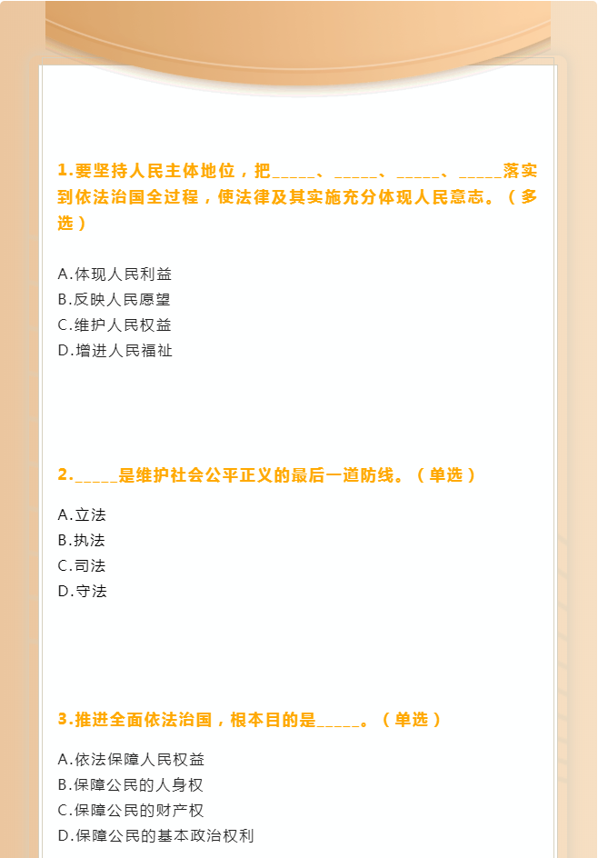 (20)纵观党百年来的历史,我们干革命、搞建设、抓改革,都是为人民谋利益,让人民过上好日子。习近平总书记指出:“我国社会主义制度保证了人民当家作主的主体地位,也保证了人民在全面推进依法治国中的主体地位。这是我们的制度优势,也是中国特色社会主义法治区别于资本主义法治的根本所在。”要坚持人民主体地位,把体现人民利益、反映人民愿望、维护人民权益、增进人民福祉落实到依法治国全过程,使法律及其实施充分体现人民意志。我们党自成立之日起就致力于建设人民当家作主的新社会,提出了关于未来国家制度的主张,并领导人民为之进行斗争。土地革命时期,我们党在江西中央苏区建立了中国历史上第一个全国性的工农民主政权——中华苏维埃共和国,开始了国家制度和法律制度建设的探索和实践。抗日战争时期,我们党建立以延安为中心、以陕甘宁边区为代表的抗日民主政权,成立边区政府,按照“三三制”原则,以参议会为最高权力机关,建立各级立法、行政、司法机关。新中国成立后,我们党创造性地运用马克思主义国家学说,为建设人民当家作主的社会主义国家制度进行了不懈努力,逐步确立并巩固了我们国家的国体、政体、根本制度、基本制度和各方面的重要制度,中国特色社会主义法律体系不断健全。我们国家的名称,我们各级国家机关的名称,都冠以“人民”的称号,这是我国社会主义国家政权的基本定位。我国国家制度深深植根于人民之中,能够有效体现人民意志、保障人民权益、激发人民创造力。(21)法治的根基在人民。人民是历史的创造者,是决定党和国家前途命运的根本力量。中华人民共和国的一切权力属于人民,人民行使国家权力的机关是全国人民代表大会和地方各级人民代表大会,必须毫不动摇坚持、与时俱进完善人民代表大会制度,支持和保证人民依法通过各种途径和形式行使国家权力。要把以人民为中心的发展思想贯穿立法、执法、司法、守法各个环节,依法治国各项工作都要贯彻党的群众路线,密切同人民群众的联系,倾听人民呼声,回应人民期待,不断解决好人民最关心最直接最现实的利益问题,凝聚起最广大人民智慧和力量。人民权益要靠法律保障,法律权威要靠人民维护。全面依法治国最广泛、最深厚的基础是人民。要充分调动人民群众投身依法治国实践的积极性和主动性,使全体人民都成为社会主义法治的忠实崇尚者、自觉遵守者、坚定捍卫者,使尊法、信法、守法、用法、护法成为全体人民的共同追求和自觉行动。(22)人民对美好生活的向往,就是我们党的奋斗目标。习近平总书记指出:“要积极回应人民群众新要求新期待,坚持问题导向、目标导向,树立辩证思维和全局观念,系统研究谋划和解决法治领域人民群众反映强烈的突出问题,不断增强人民群众获得感、幸福感、安全感,用法治保障人民安居乐业。”现在,人民群众对美好生活的向往更多向民主、法治、公平、正义、安全、环境等方面延展。由于历史和现实的多方面原因,目前立法、执法、司法、普法方面还有不少薄弱环节,有一些人民群众不满意甚至意见很大的地方,这要成为厉行法治的聚焦点和发力点。解决制约高质量发展的种种问题,克服部门保护主义和地方保护主义、维护市场秩序、保护知识产权、打击假冒伪劣产品、保护生态环境,保障人民民主、维护社会主义法治权威和尊严、克服执法不严和司法不公、解决人民最关心的教育、就业、收入分配、社会保障、医药卫生、住房等方面的突出问题,解决促进社会公平正义、完善互联网管理、加强安全生产、保障食品药品安全、改革信访工作制度、创新社会治理体制、维护社会和谐稳定等方面的难题,克服公器私用、以权谋私、贪赃枉法等现象,克服形式主义、官僚主义、享乐主义和奢靡之风,反对特权现象,惩治消极腐败现象等,都需要密织法律之网、强化法治之力。(23)政法机关在保障人民安居乐业、服务经济社会发展、维护国家安全和社会稳定中具有十分重要的作用。政法机关是老百姓平常打交道比较多的部门,是群众看党风政风的一面镜子。要广泛听取人民群众意见,深入了解一线司法实际情况、了解人民群众到底在期待什么,把解决了多少问题、人民群众对问题解决的满意度作为评判改革成效的标准。要顺应人民群众对公共安全、司法公正、权益保障的新期待,全力推进平安中国、法治中国、过硬队伍建设,坚持从严治警,坚决反对执法不公、司法腐败,进一步提高执法司法能力,进一步增强人民群众安全感和满意度,进一步提高政法工作亲和力和公信力,保证中国特色社会主义事业在和谐稳定的社会环境中顺利推进。(24)“理国要道,在于公平正直”。公平正义是中国特色社会主义的内在要求,是我们党追求的一个非常崇高的价值。为什么我们能够创造经济快速发展和社会长期稳定“两大奇迹”?很重要的一条就是我们党始终坚持以人民为中心的发展思想,把促进社会公平正义、增进人民福祉作为各项工作的出发点和落脚点,不断实现好维护好发展好最广大人民的根本利益。公正是法治的生命线。法治不仅要求完备的法律体系、完善的执法机制、普遍的法律遵守,更要求公平正义得到维护和实现。全面依法治国,必须紧紧围绕保障和促进社会公平正义来进行。