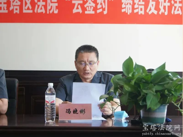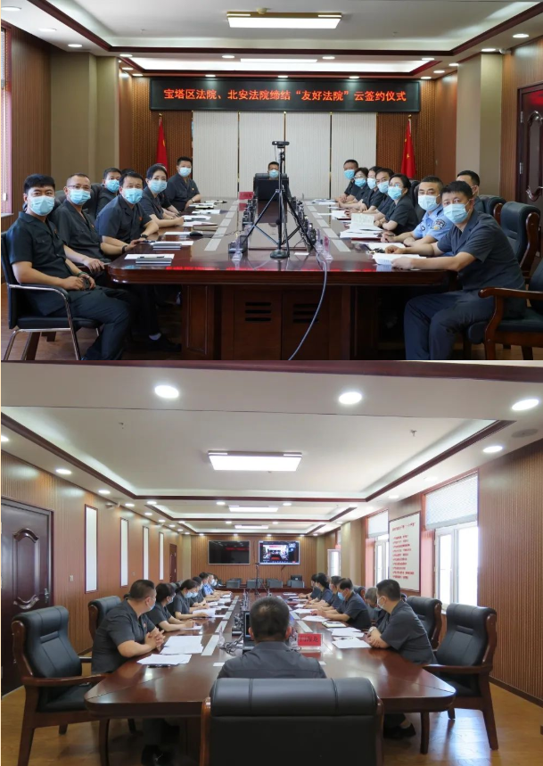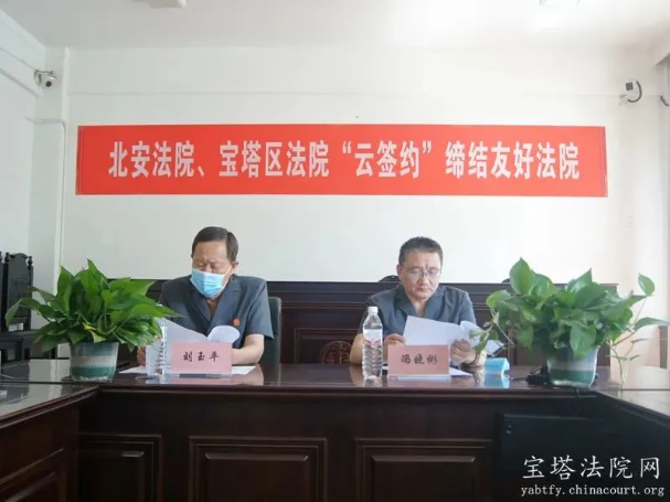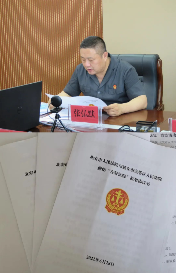 6月28日下午,北安法院与延安市宝塔区法院通过“云签约”的形式,举行了“友好法院”缔结签约仪式。北安法院党组书记、院长闫海龙,宝塔区法院党组书记、院长冯晓彬出席签约仪式,双方签署了《北安法院与延安市宝塔区法院缔结“友好法院”框架协议书》,北安法院党组副书记、副院长张弘默主持线上签约仪式,双方法院班子成员、专职审委、相关部门负责人参加了签约仪式。