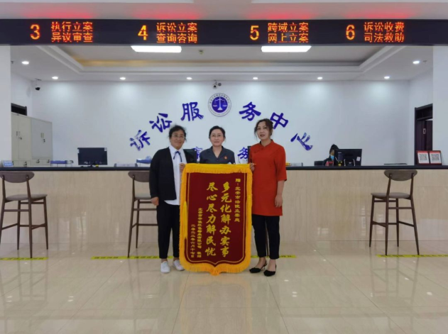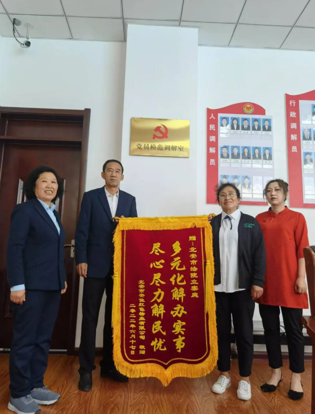 “非常感谢法院党员模范调解室,为我们解决了多年来物业管理的烦心事”。近日,北安市某物业公司董事长陏某将一面鲜红的锦旗交到立案庭庭长吴莹手中,锦旗上“多元化解办实事,尽心尽力解民忧”几个大字,展现了物业公司与居民群众对“党员模范调解室”调解员辛苦付出的充分肯定。