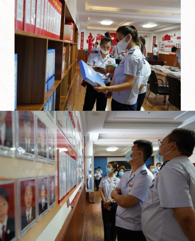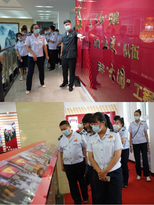 在“三红”党建文化长廊,讲解员围绕“北法红色映象”党建工作品牌,为税务机关党务干部介绍了法院党建工作总体思路,通过“三红”党建,打造“五硬”队伍,筑牢“六固”工程,坚持以党建带队建促审判,将党建工作与审判执行工作充分融合,发挥支部的战斗堡垒作用的党员的先锋模范作用,在安检、立案窗口、审执一线党员主动亮明党员身份,践行司法为民宗旨,服务社会大局稳定。
