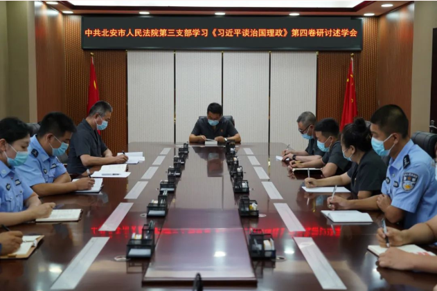 北安法院全体党员干警把学习《习近平谈治国理政》第四卷作为进一步加深对习近平新时代中国特色社会主义思想的认识理解,坚持党对法院工作的绝对领导,坚持以人民为中心的司法服务,坚持对审判的监督制约,切实把学习成效转化为改造主观世界和客观世界的实际成果,坚持全面系统学、融会贯通学,读原著学原文、悟原理知原义,发扬理论联系实际的马克思主义学风,结合审判执行工作实际,更好地运用习近平新时代中国特色社会主义思想武装头脑、指导实践、推动工作。