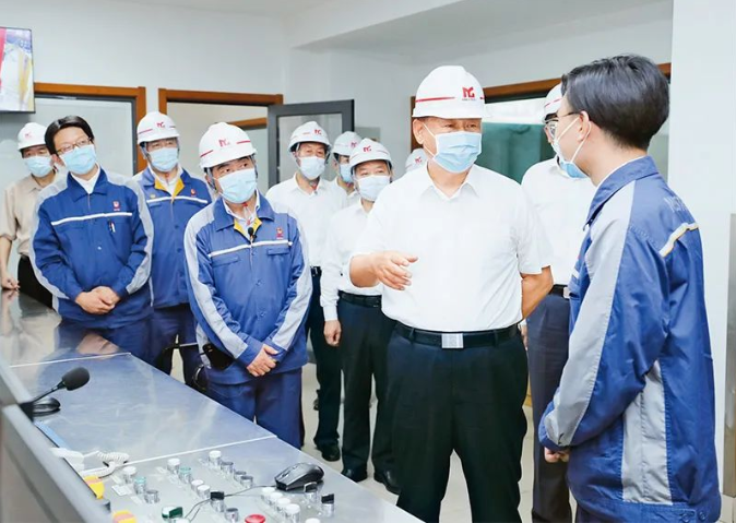 2020年8月18日至21日,中共中央总书记、国家主席、中央军委主席习近平在安徽省考察。这是19日上午,习近平在马鞍山市中国宝武马钢集团优质合金棒材车间考察,了解企业复工复产和经营情况。新华社记者鞠鹏/摄