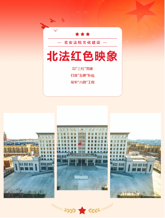 1948年11月北安市人民法院在这里诞生,2022年北安法院机关党委正式成立,确定了“北法红色映象”党建品牌,以传承红色基因为主线,坚持以“三红”党建,打造“五硬”队伍,筑牢“六固”工程的党建工作思路,实现“把党组建成旗帜,把支部建成堡垒,把党员建成先锋”的党建工作目标。