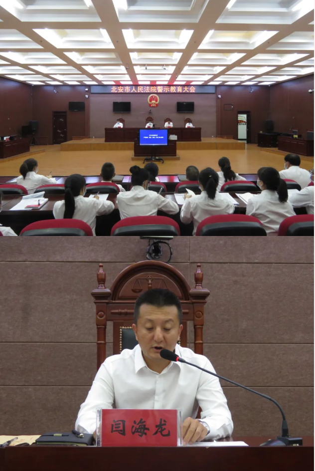 9月8日下午,北安法院召开警示教育大会,党组书记、院长闫海龙出席会议并讲话,党组副书记、副院长张弘默主持会议,班子成员、全院干警参加会议。