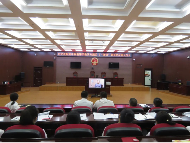 会上,党组成员、副院长王春胜领学了省法院2021年度违法违纪典型案例;党组成员、审管办主任朱凯宣读了北安法院第十三期工作通报;两名聘用制书记员进行了深刻检讨;全院干警共同观看了警示教育专题片《“低调”局长的反面人生》。