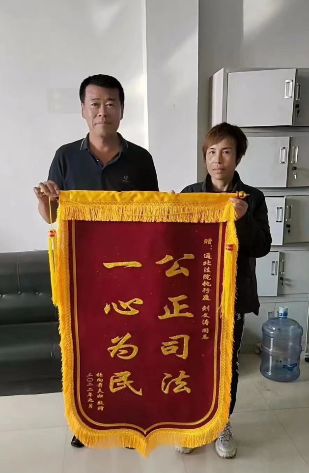 日前,农民工向某的妻子将一面绣有“公正司法,一心为民”字样的锦旗送到通北审判团队执行工作人员刘文涛手中,感激之情溢于言表。