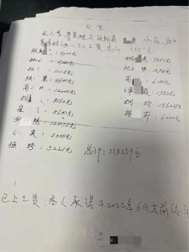 2012年来,原告高某等16人一直在李某夫妻经营的宾馆打工,因经营不善,2014年至2020年间李某夫妻累计欠薪11万余元。多次索要未果,无奈诉至法院。 “胡某玲15624元,张某英4000元,高某凤12200元,刘某荣8150元,邱某艳12475元……”张丹看着欠条上一个个名字,一笔笔欠款,心间酸涩。