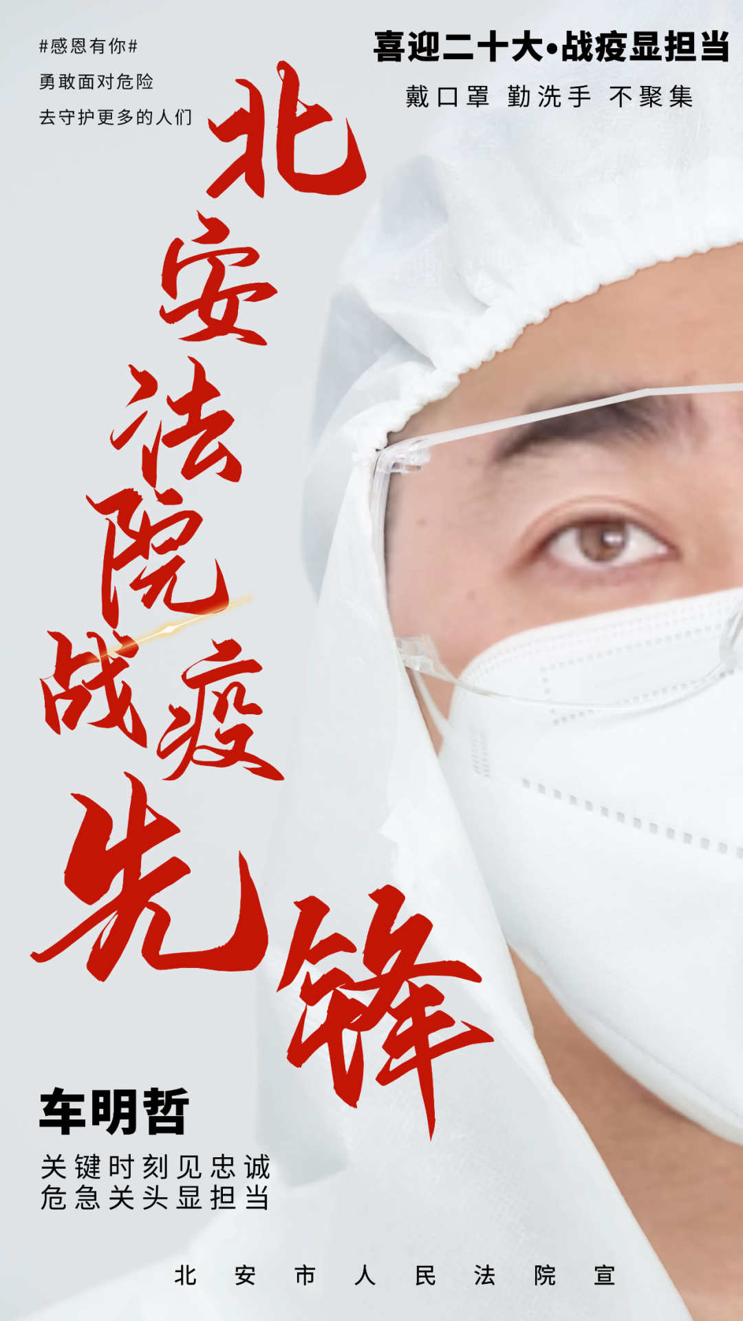 关键时刻见忠诚,危急关头显担当。面对突如其来的新冠肺炎疫情考验,北安法院党组织和广大党员干部挺身在前,在疫情防控一线亮身份、做表率、见行动。院党组迅速响应,组建党员突击队、党员先锋队、临时党支部,党员干警转变角色,积极配合北安市疫情防控指挥部,协助做好隔离转运和终端消杀等工作,全力构筑疫情防控红色堡垒,勇当疫情防控红色尖兵,让党旗在疫情防控一线高高飘扬,以优异的成绩向党的二十大献礼。今天的“喜迎二十大 战疫显担当”专栏,让我们走近消杀组车明哲。