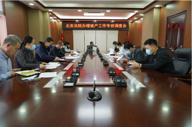 近日,北安法院召开优化营商环境办理破产工作专班调度会,院党组副书记、副院长张弘默主持会议,院党组成员、副院长王春胜、办理破产工作专班全体成员及相关责任部门参加会议。
