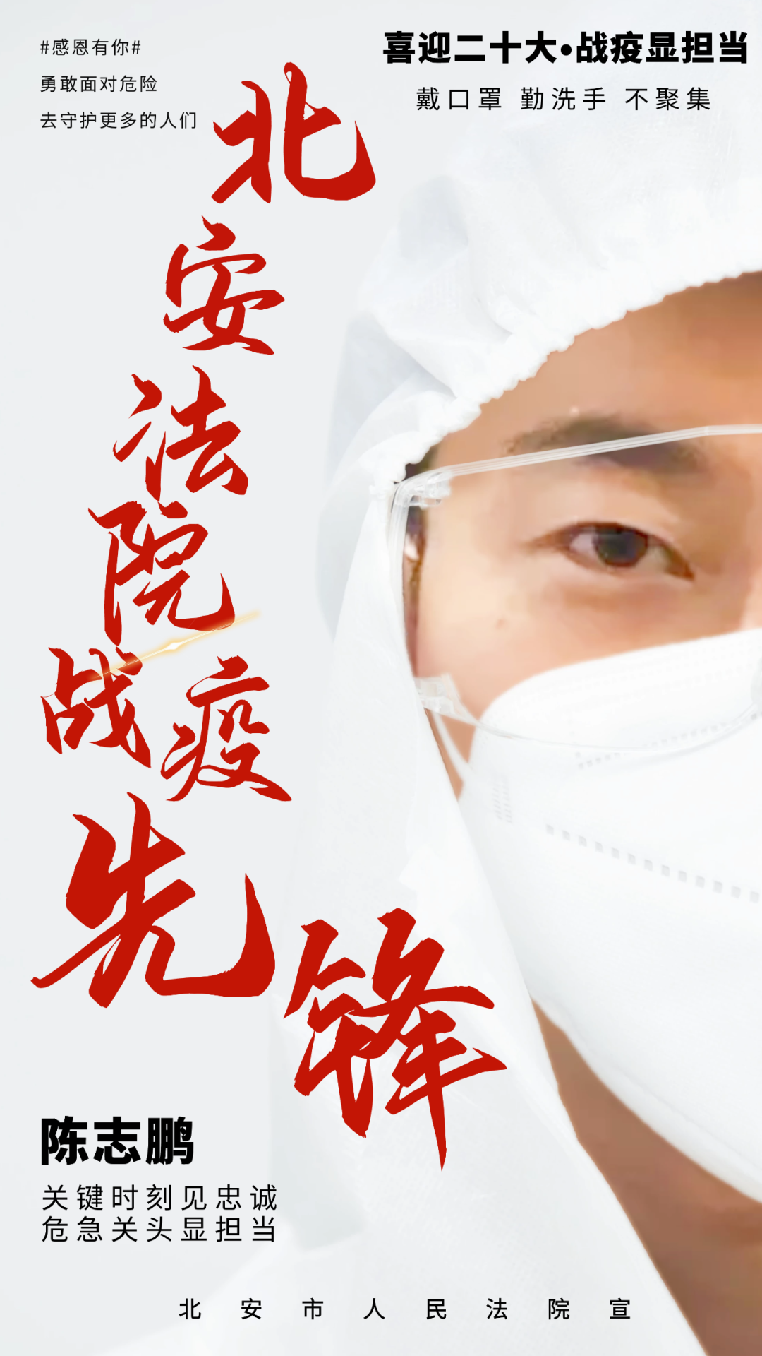 陈志鹏,男,汉族,1990年8月出生,研究生学历,毕业于哈尔滨理工大学软件工程专业,工程硕士学位,2017年9月进入北安市人民法院工作,现任北安市人民法院法官助理。2022年4月借调至北安市疫情指挥部转运隔离组工作。自参加疫情防控工作以来,该同志恪尽职守,全力以赴,始终以党员干部的要求来严格要求自己,用忘我的工作态度诠释着一名法院干警不忘初心、牢记使命的一身热情。