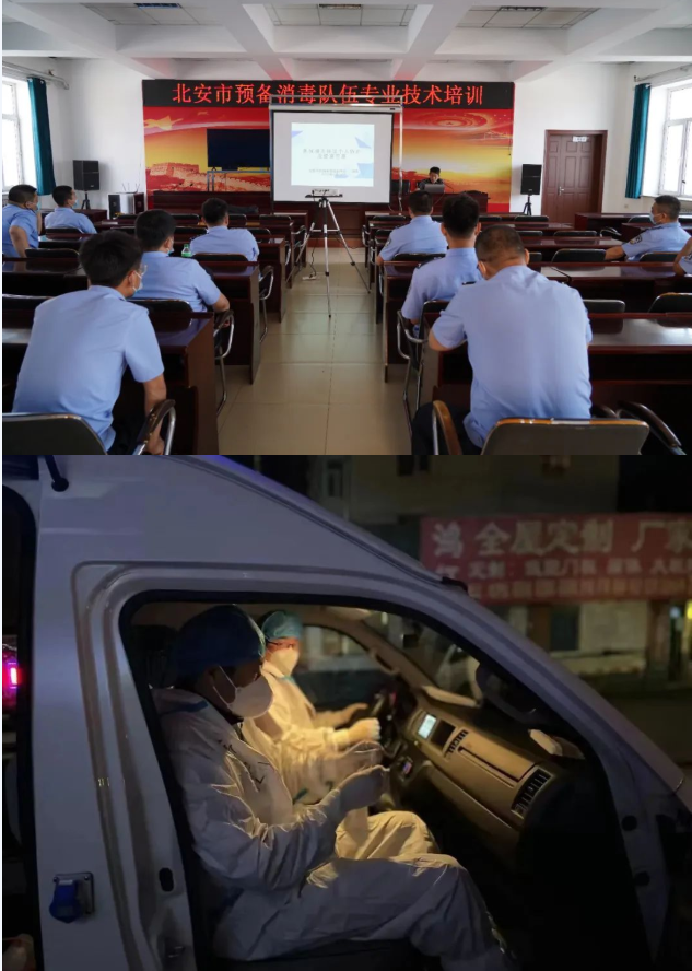 终末消杀每天的工作环境就是确诊病例或无症状感染者的生活场所,队员们每天都与人人谈之色变的新冠肺炎病毒面对面对决,被感染的风险和几率极大。但对每名队员来说,终末消杀就是一场没有后退可言、没有危险可惧、必须胜利的战斗。比消杀过程更困难的是队员们每天要穿着密不透气的防护服,戴着手套、鞋套、头套、面罩、护目镜、口罩,背着20公斤重的消杀装备,伴着机械马达震耳欲聋的轰鸣声连续工作数个小时,爬到隔离宾馆的最顶层早已大汗淋漓,还要对所有区域从上至下,由内而外进行消杀,工作期间,不能喝水,不能上卫生间,甚至连汗水都不能擦拭......截止目前,协助黑河转运隔离人员场所消杀,司法警察共执行消杀任务31次,消杀房间550余间(含协助风景区消杀任务),消杀面积达65000余平米。随后,北安疫情爆发,司法警察消杀小组共计执行消毒工作任务33次,出动干警55人次,消杀阳性病例房间22间,消杀公共区域面积4万平方米,清除室内垃圾80袋,消杀车辆10辆。司法警察大队还承担着转运警卫,黑河疫情期间,法警队共出警11次,出警44人,接收密接人员33车,660余人,协助疫情防控指挥部信息报送等任务。